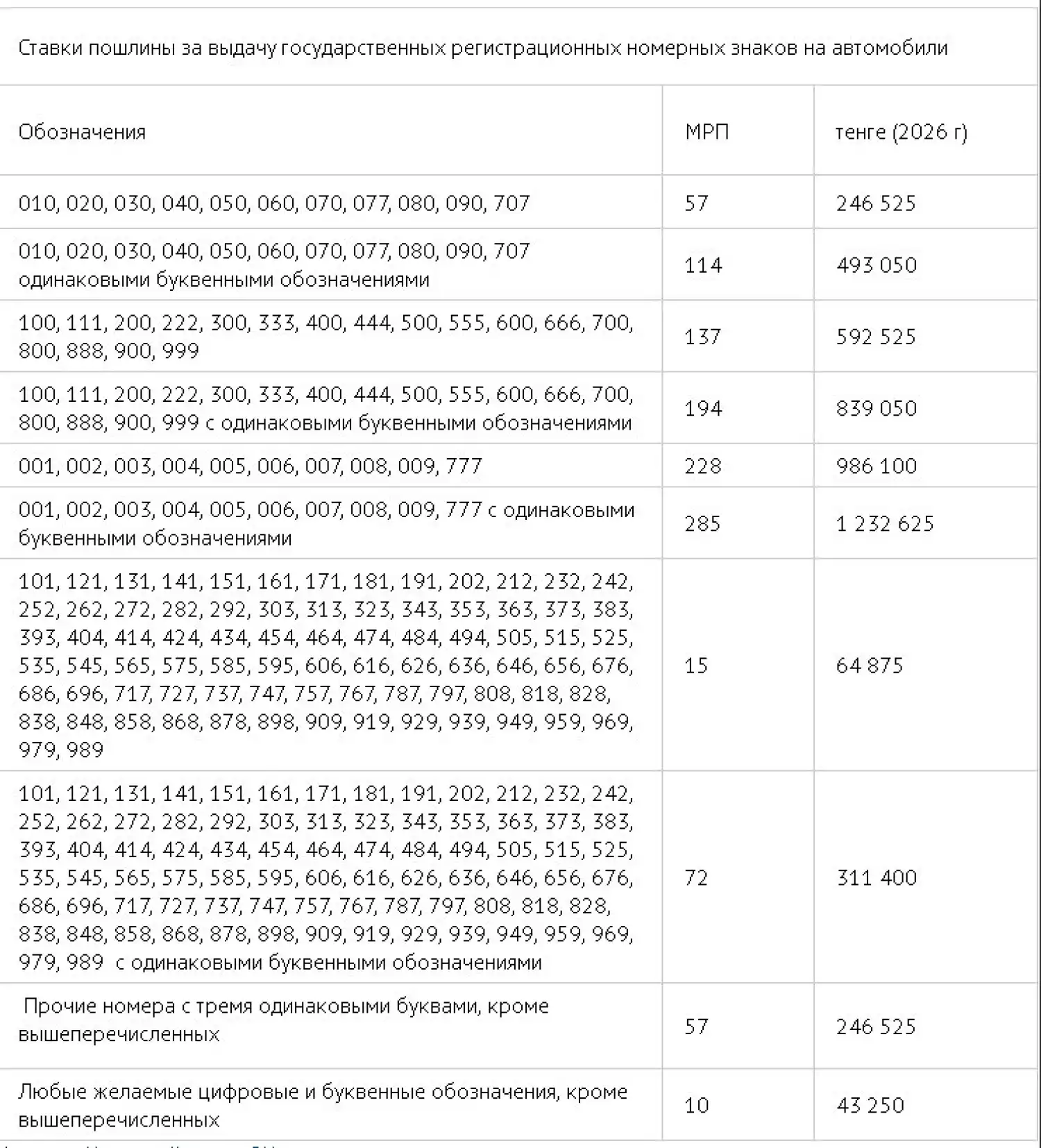 Цены на государственные номера различаются в зависимости от популярности и эксклюзивности комбинаций. На сайте eGov.kz указано, что стоимость номеров начинается от суммы в размере 10 МРП и может доходить до 285 МРП для самых востребованных и престижных комбинаций. В тенге это составляет от 43 тысяч до 1,232 миллиона. Далее представлена подробная таблица с категориями номеров и их стоимостью на 2026 год.