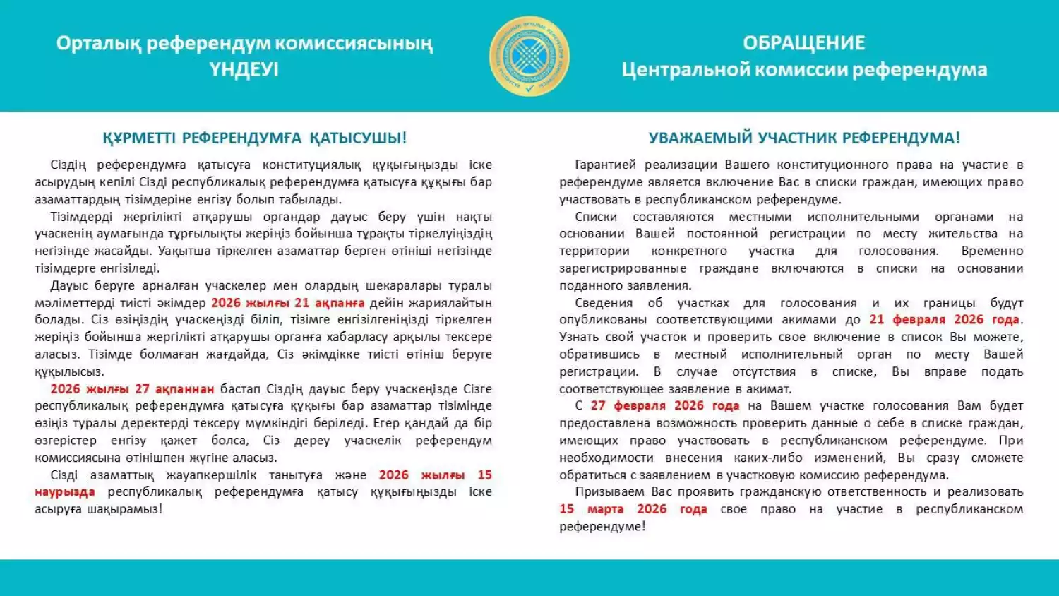 Открывая заседание, председатель региональной территориальной комиссии референдума Сергали Айдапкелов сообщил, что Указом Президента Республики Казахстан Касым-Жомарта Токаева № 1170 республиканский референдум по проекту новой Конституции Республики Казахстан запланирован на 15 марта текущего года. Он проинформировал, что на референдуме будет задан вопрос: «Поддерживаете ли вы новую Конституцию Республики Казахстан, проект которой был опубликован в СМИ 12 февраля 2026 года?».