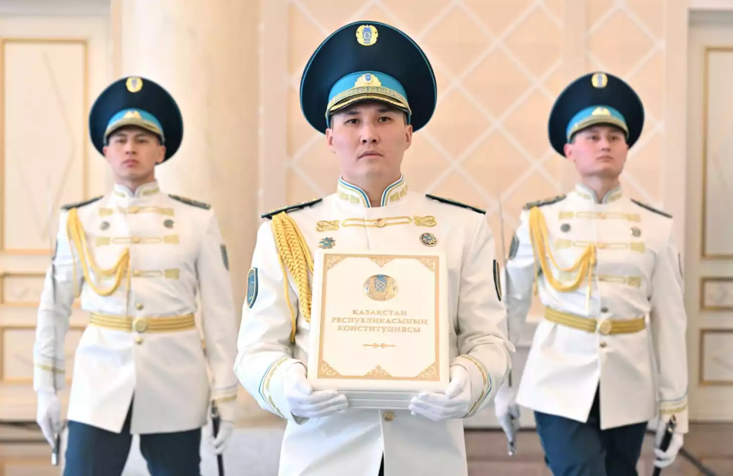 Почетный караул торжественно внес новую Конституцию Республики Казахстан, был исполнен Государственный гимн.