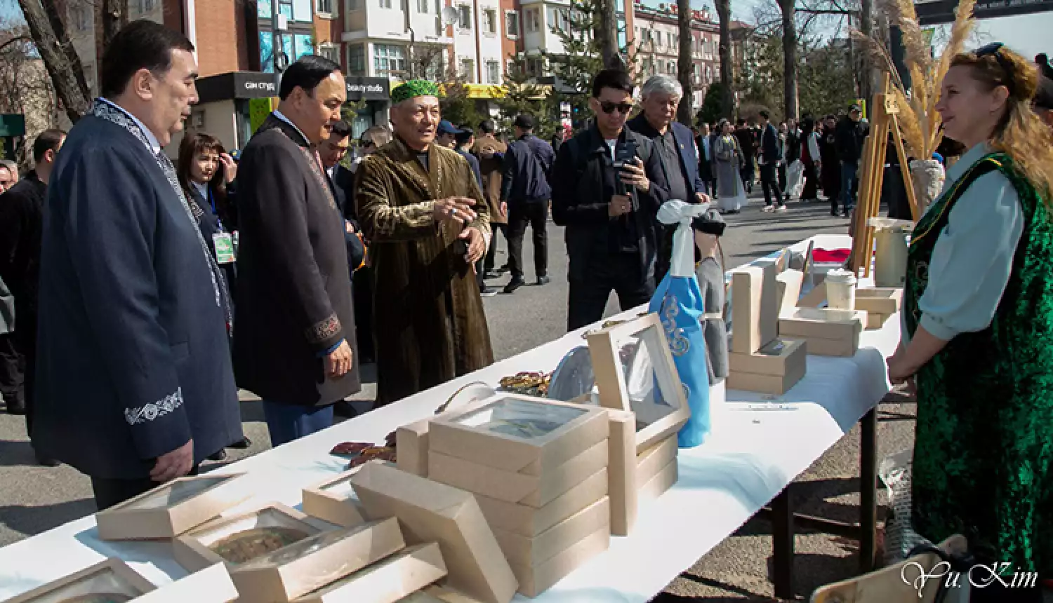 На площадке праздника по проспекту Толе би были установлены белоснежные юрты, возле каждой из которых различные организации и учреждения города и области представили свою культурную программу. В юртах в этот раз не было больших дастарханов, разве что традиционные казахские угощения на Наурыз, такие как баурсаки, курт, зато больше внимания было уделено демонстрации национальных ремесел и традиций.
